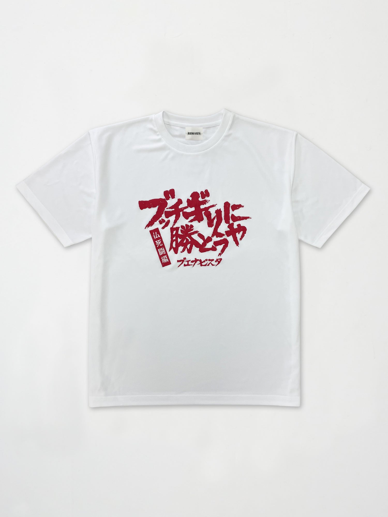 BUENA VISTAらしいストレートな応援メッセージをプリントした〈ぶっちぎり仏死闘編tee〉。来たるフランス、パリでの戦いの勝利を願って制作した一着。石塚の地元である京都の方言を用いた力強いワードチョイスが魅力。2024年7月から8月にかけて開催される一大イベントには、〈ぶっちぎり仏死闘編tee〉を着て、ファン一丸となって日本を勝利に導こう!
